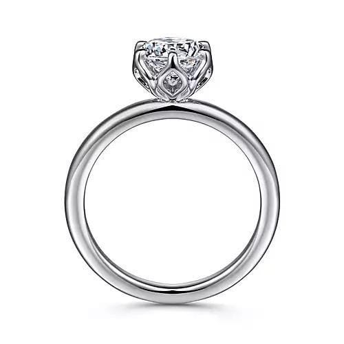 This 14 Karat White Gold solitaire engagement ring showcases a Signature lab-grown diamond, set elegantly in a unique floral-inspired setting. The simplicity of the plain shoulders emphasizes the brilliance of the round brilliant cut diamond at its center. Perfect for those seeking a timeless and graceful design, this ring combines understated elegance with contemporary craftsmanship, making it a beautiful choice for a lifelong commitment.