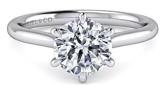 This classic 14 Karat White Gold engagement ring showcases a Signature brilliant cut lab-grown diamond. Its minimalist design with plain shoulders emphasizes the brilliance of the centre stone, held securely in place by six elegant prongs. The sleek band allows the diamond to take centre stage, making this ring a timeless choice for a special proposal. Customizable to your preference, this piece offers the option to adjust diamond shape, size, or metal type for a truly personalized touch, all backed by our One Year Satisfaction Guarantee for your complete peace of mind.
