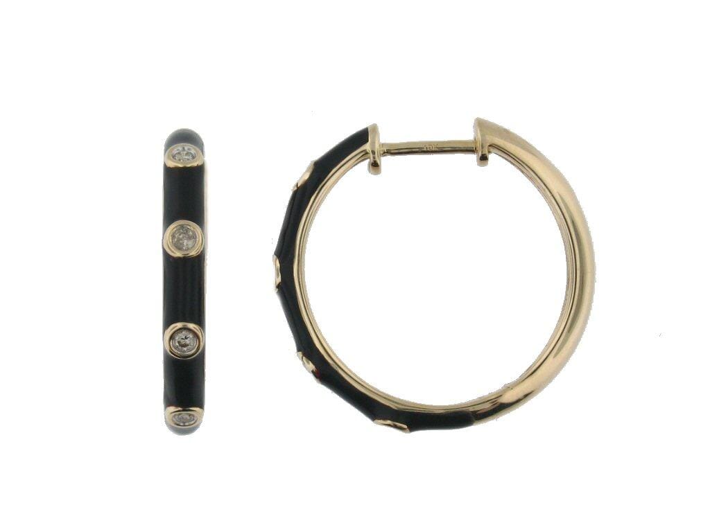Yellow Gold Diamond Black Enamel Hoop Earrings.