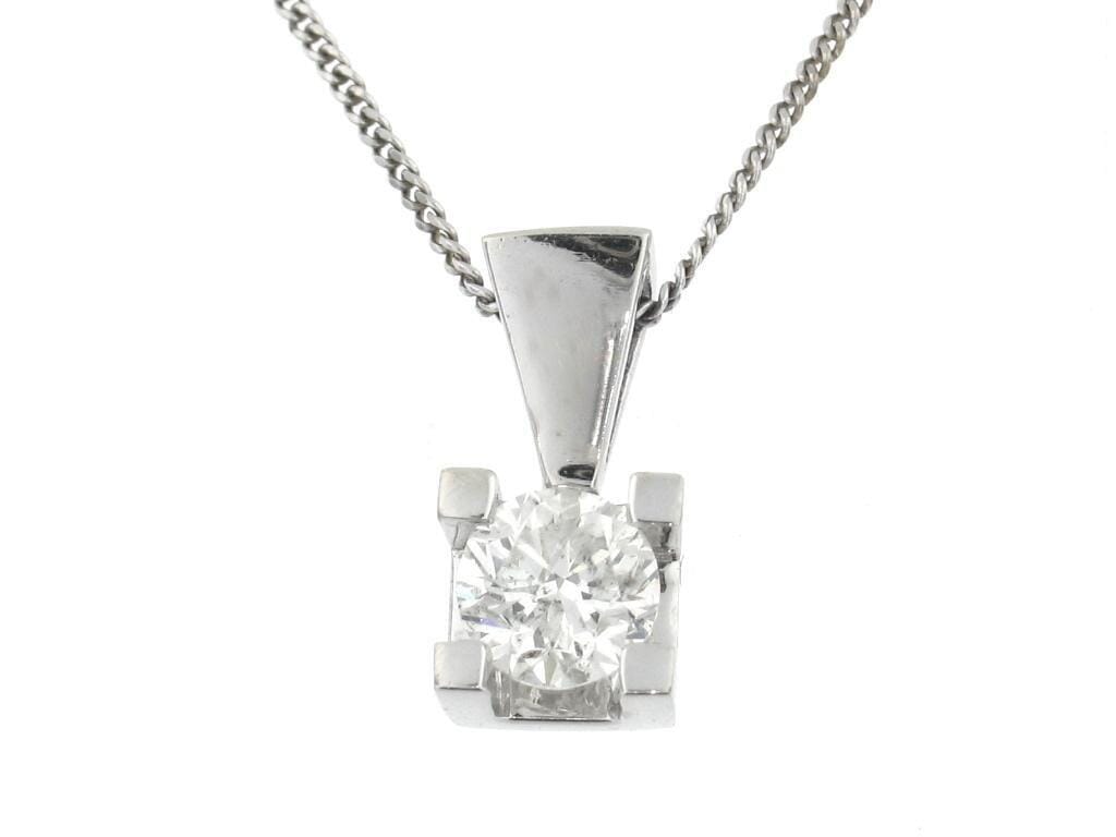 14 Karat White Gold Diamond Solitaire Pendant Necklace. 0.50 Carat Total Diamond Weight. This pendant comes with an 18 inch 14K white gold chain as shown. Alternate chain length, weight, or style options are available.