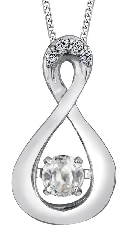 This elegant 10 karat white gold pendant necklace features a round brilliant cut diamond accented by additional sparkling stones. The pendant showcases a central diamond set in a unique pulse setting, surrounded by accent diamonds that add to its brilliance. Measuring 12.8mm in height and 7.1mm in width, this piece is complemented by a 10K white gold chain, offering a complete and stylish accessory. The graceful infinity-inspired design and shimmering diamonds make this pendant an exquisite addition to enhance your ensemble.