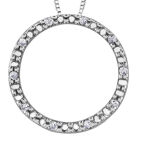 10 Karat White Gold Diamond Circle Pendant Necklace. 0.05 Carat Total Diamond Weight. This pendant comes with an 18 inch 10K white gold chain as shown. Alternate chain length, weight, or style options are available.
