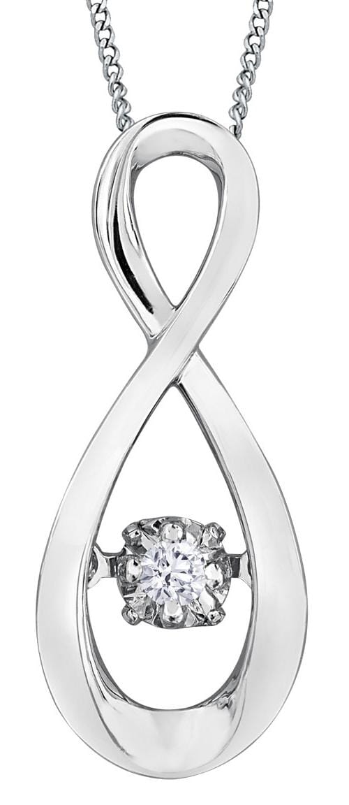 This elegant 10 karat white gold pendant necklace features a round brilliant cut diamond set in a unique PULSE setting. The pendant showcases an infinity-inspired design, with the central diamond creating a captivating sparkle with every movement. Measuring 19.0mm in height and 7.8mm in width, this piece is complemented by a 10K white gold chain, offering a complete and stylish accessory. The graceful design and shimmering diamond make this pendant a sophisticated choice, perfect for adding a touch of timeless elegance to any outfit.