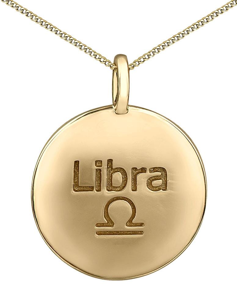 10 Karat Yellow Gold Diamond "Libra" Zodiac Pendant Necklace. 0.009 Carat Total Diamond Weight. This pendant comes with an 18 inch 10K yellow gold chain as shown. Alternate chain length, weight, or style options are available.