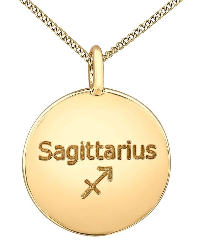 10 Karat Yellow Gold Diamond "Sagittarius" Zodiac Pendant Necklace. 0.01 Carat Total Diamond Weight. This pendant comes with an 18 inch 10K yellow gold chain as shown. Alternate chain length, weight, or style options are available.