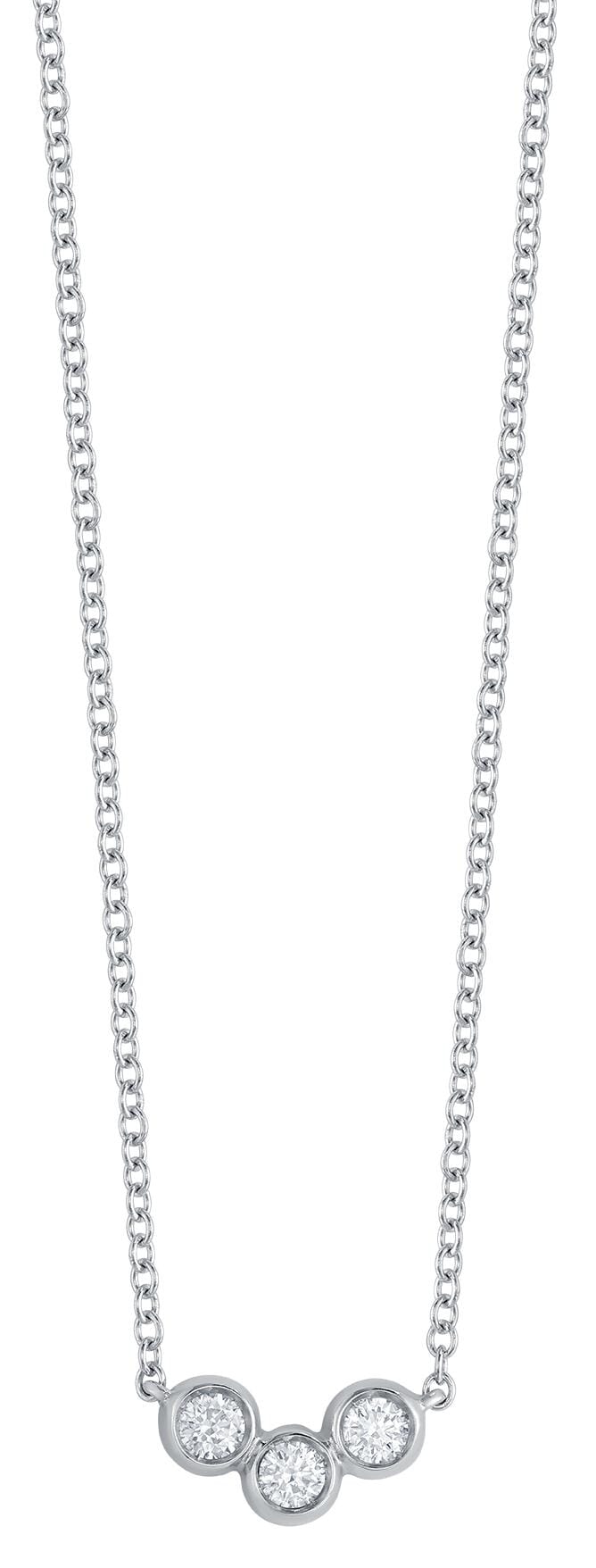 18 Karat White Gold Diamond Pendant 0.11 Carat Total Diamond Weight Inspired by the movement and vitality of flowing water, this necklace captures a sense of energy and lightness. Crafted in 18kt white gold, it features three round brilliant-cut diamonds totalling 0.11 carat, adding a touch of radiant sparkle to any look.