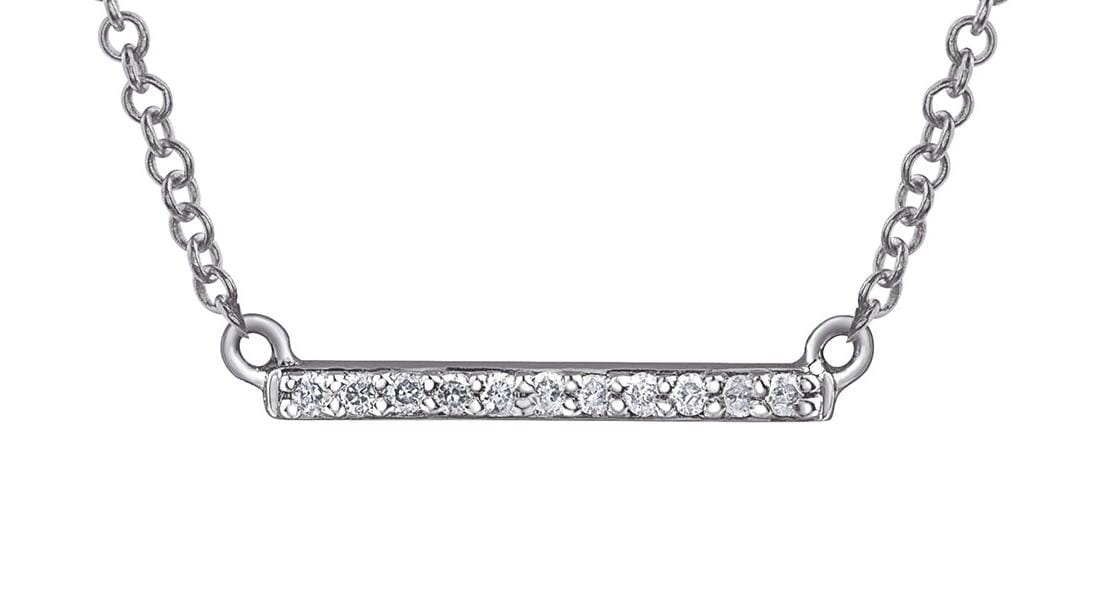 10 Karat White Gold Diamond Bar Pendant Necklace. 0.06 Carat Total Diamond Weight. This pendant comes with an 18 inch 10K white gold chain as shown. Alternate chain length, weight, or style options are available.