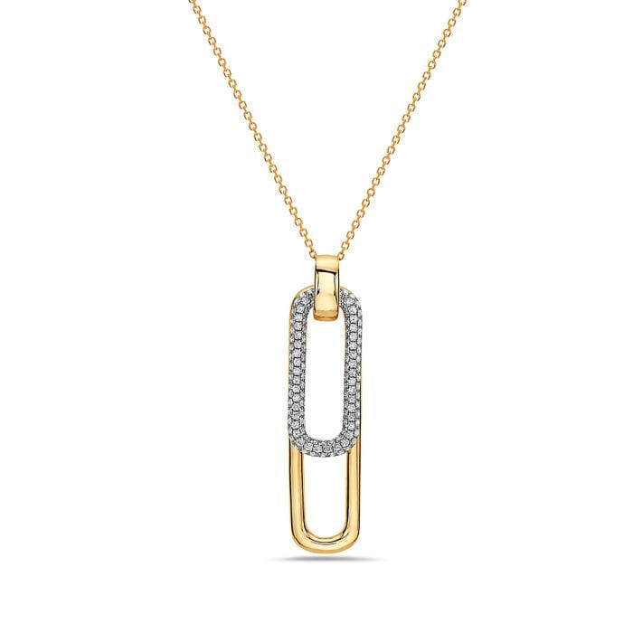 This elegant 14 karat yellow gold pendant necklace features white gold accents and round brilliant cut diamonds. The pendant is adorned with sparkling diamonds, creating a sophisticated and captivating look. The unique design, combining yellow and white gold, adds versatility and charm to the piece. Perfect for any special occasion, this pendant comes with a 14K yellow gold chain. The pendant measures 37.7mm in height and 9.1mm in width. The harmonious blend of modern and classic elements makes this necklace a timeless treasure for years to come.