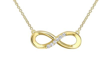 10 Karat Yellow Gold Diamond Infinity Pendant Necklace. 0.06 Carat Total Diamond Weight. This pendant comes with an 18 inch 10K yellow gold chain as shown. Alternate chain length, weight, or style options are available.