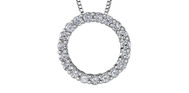 10 Karat White Gold Diamond Circle Pendant Necklace. 0.25 Carat Total Diamond Weight. This pendant comes with an 18 inch 10K white gold chain as shown. Alternate chain length, weight, or style options are available.