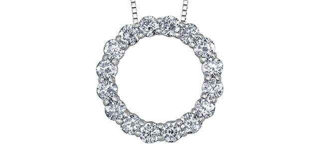 10 Karat White Gold Diamond Circle Pendant Necklace. 0.50 Carat Total Diamond Weight. This pendant comes with an 18 inch 10K white gold chain as shown. Alternate chain length, weight, or style options are available.