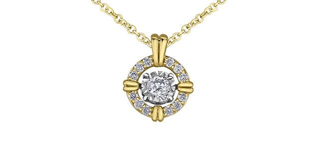 10 Karat Yellow Gold, White Gold Diamond Pulse Pendant Necklace. 0.24 Carat Total Diamond Weight. This pendant comes with an 18 inch 10K yellow gold chain as shown. Alternate chain length, weight, or style options are available.