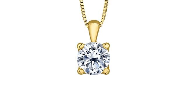 14 Karat Yellow Gold Canadian Diamond Drop Pendant Necklace. 0.50 Carat Total Diamond Weight. This pendant comes with an 18 inch 14K yellow gold chain as shown. Alternate chain length, weight, or style options are available.