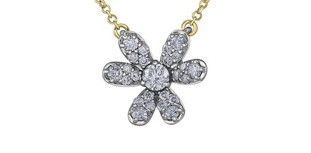 10 Karat White Gold, Yellow Gold Accent Diamond Flower Pendant Necklace. 0.50 Carat Total Diamond Weight. This pendant comes with an 18 inch 10K yellow gold chain as shown. Alternate chain length, weight, or style options are available.
