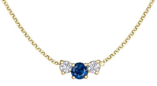 14 Karat Yellow Gold Blue Sapphire, Diamond Pendant Necklace. 0.18 Carat Total Diamond Weight. This pendant comes with an 18 inch 14K yellow gold chain as shown. Alternate chain length, weight, or style options are available.
