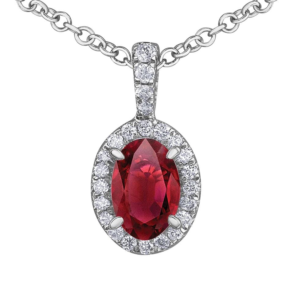 The 10 Karat White Gold Ruby and Diamond Pendant Necklace features an oval-shaped ruby, elegantly surrounded by a halo of sparkling diamonds. The fiery red of the ruby contrasts beautifully with the shimmer of white diamonds, making it an eye-catching piece. Alternate chain lengths, weights, or style options are available to suit your preference. The pendant, measuring 13.5 mm in height and 6.9 mm in width, exudes sophistication and is perfect for adding a touch of luxury to any ensemble.