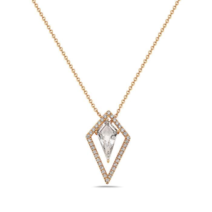 This striking 14 Karat Yellow Gold Pendant Necklace showcases a uniquely cut white topaz, perfectly framed within a diamond-accented geometric design. The fancy-shaped white topaz captures light beautifully, creating a brilliant display, while the surrounding diamonds add an extra layer of sparkle and sophistication. Measuring 18.2mm in height and 10.8mm in width, this pendant is an eye-catching piece that delicately balances modern elegance with timeless appeal. The necklace comes with an 18-inch yellow gold chain, though alternative lengths and styles are available to suit your preference. This stunning necklace is a luxurious addition to any jewellery collection.
