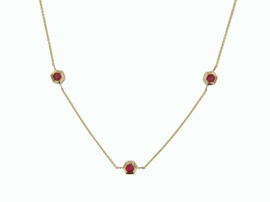 10 Karat Yellow Gold Ruby Station Pendant Necklace. This pendant comes with an 18 inch 10K yellow gold chain as shown. Alternate chain length, weight, or style options are available.