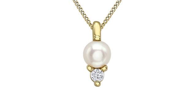 10 Karat Yellow Gold Pearl, Diamond Pendant Necklace. 0.01 Carat Total Diamond Weight. Total Diamond Weight. This pendant comes with an 18 inch 10K yellow gold chain as shown. Alternate chain length, weight, or style options are available.
