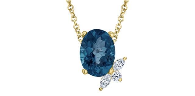 10 Karat Yellow Gold London Blue Topaz, Diamond Solitaire Pendant Necklace. 0.070 Carat Total Diamond Weight. This pendant comes with an 18 inch 10K yellow gold chain as shown. Alternate chain length, weight, or style options are available.