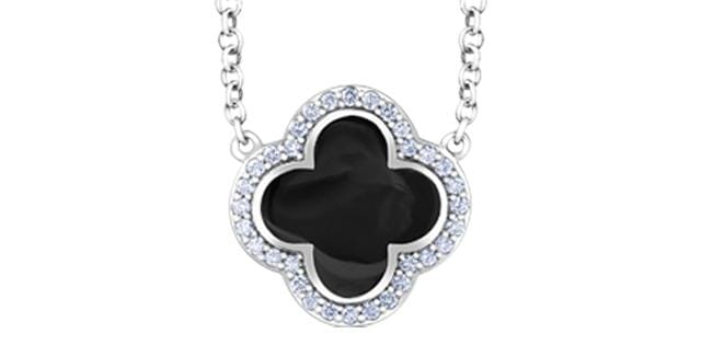 10 Karat White Gold Onyx, Diamond Pendant Necklace. 0.24 Carat Total Diamond Weight. This pendant comes with an 18 inch 10K white gold chain as shown. Alternate chain length, weight, or style options are available.