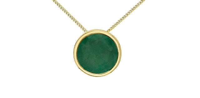 10 Karat Yellow Gold Emerald Circle Pendant Necklace. This pendant comes with an 18 inch 10K yellow gold chain as shown. Alternate chain length, weight, or style options are available.