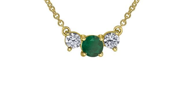 14 Karat Yellow Gold Emerald, Canadian Diamond Pendant Necklace. 0.18 Carat Total Diamond Weight. This pendant comes with an 18 inch 10K yellow gold chain as shown. Alternate chain length, weight, or style options are available.