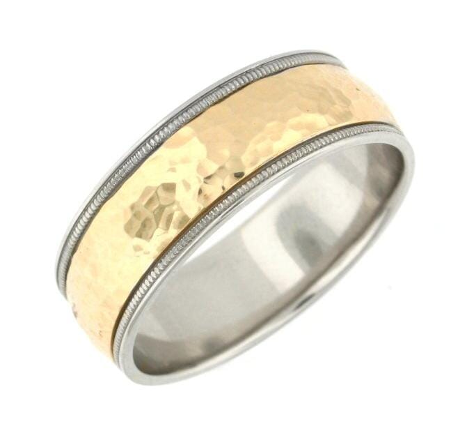 White Gold Mens Band. Comfort Fit, Hammered, Textured Inlay Milgrained Edge
