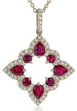14 Karat Rose Gold Ruby, Diamond Pendant Necklace. 0.23 Carat Total Diamond Weight This pendant comes with an 19 inch 14K rose gold chain as shown. Alternate chain length, weight, or style options are available.