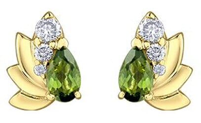 10 Karat Yellow Gold Green Tourmaline, Diamond Stud Earrings. 0.13 Carat Total Diamond Weight.
