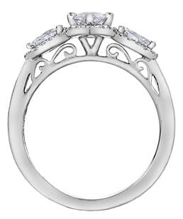 This stunning 18 Karat White Gold engagement ring showcases a marquise-shaped Canadian diamond at its centre, flanked by two pear-shaped diamonds, creating an elegant three-stone design. A delicate halo of diamonds surrounds each stone, enhancing their brilliance and adding an exquisite touch. The combination of the marquise centre and pear-shaped sides brings a unique flair to this classic piece. Ideal for a timeless proposal, this ring is also customizable to suit your preferences, whether you wish to alter the diamond shape, size, or metal type.