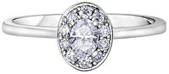This elegant 10 Karat White Gold diamond engagement ring showcases an oval-shaped diamond, beautifully surrounded by a halo of accent diamonds. The plain shoulders enhance the classic and refined design, creating a timeless look. Perfect for marking a special moment, this ring embodies sophistication and grace.