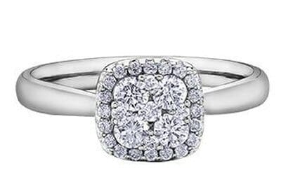 This elegant 14 Karat White Gold engagement ring features a stunning cluster of diamonds arranged in a cushion shape, surrounded by a brilliant diamond halo. The smooth, plain shoulders offer a refined backdrop, allowing the clustered diamonds to take centre stage. This piece combines classic allure with a modern touch, making it an ideal choice for celebrating a special moment.