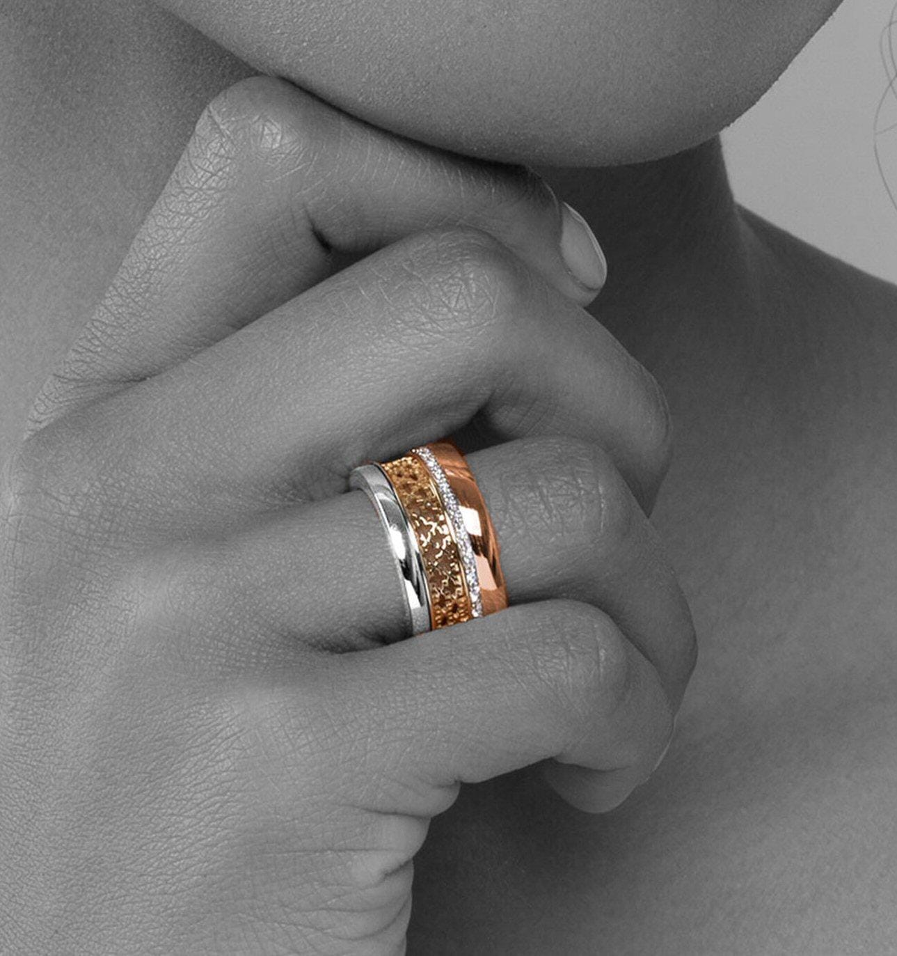 18 Karat Tri-Gold Diamond Ring. 0.29 Carat Total Diamond Weight. Crafted in a harmonious trio of 18kt gold tones, this striking ring blends yellow, rose, and white gold in a contemporary layered design. A 0.29ct circle of shimmering diamonds anchors the piece at its centre, adding brilliance to its bold form. The ring measures 10.50mm in width, 21.04mm in outer diameter, and 1.80mm in thickness.This is a clearance item. If you require a specific size, we’re happy to help! Please note that some sizes will incur a sizing fee.