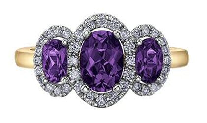 This exquisite 10 Karat Yellow Gold ring features three stunning oval-shaped amethysts at its center. Each gemstone is elegantly surrounded by a halo of accent diamonds, adding a touch of sparkle to the sophisticated design. This piece is perfect for adding a luxurious flair to any occasion. The refined and timeless design ensures this ring will be a cherished addition to your jewellery collection.
