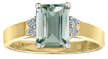 10 Karat Yellow Gold, White Gold Accent Green Amethyst, Diamond Ring. 0.06 Carat Total Diamond Weight.