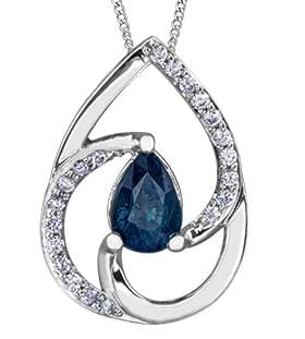 This exquisite 10 Karat White Gold pendant necklace features a captivating pear-shaped Blue Sapphire at its center, elegantly surrounded by a shimmering array of accent diamonds. The intertwining design of the pendant creates a fluid and graceful look, enhancing the deep blue of the sapphire with its radiant diamond accents. The pendant measures 16.8mm in height and 12.0mm in width, making it a striking yet refined piece. It comes with an 18-inch 10K white gold chain, offering a perfect complement to the pendant's sophisticated design. This necklace is a versatile addition to any jewellery collection, suitable for both special occasions and everyday elegance.