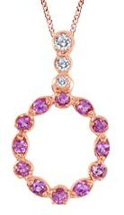 10 Karat Rose Gold Pink Sapphire, Canadian Diamond Circle Pendant Necklace. 0.045 Carat Total Diamond Weight. This pendant comes with an 18 inch 10K rose gold chain as shown. Alternate chain length, weight, or style options are available.