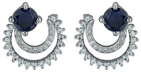 These exquisite 10 Karat White Gold earrings feature a stunning round brilliant cut created blue sapphire, beautifully accented with sparkling diamonds. The elegant design combines modern style with classic charm, showcasing a central blue sapphire surrounded by a crescent of shimmering diamonds. The earrings measure 13.8mm in height and 12.7mm in width, making them a perfect choice for any occasion. These earrings are a sophisticated and stylish addition to any jewellery collection, adding a touch of elegance and luxury to your ensemble.