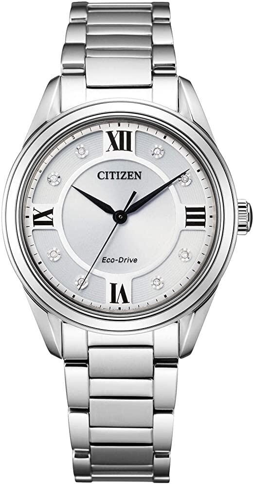 Additionally, Eco-Drive technology allows your timepiece to charge in any light, eliminating the need for a battery.Features: 32mm stainless steel case; Silver-tone three-hand dial; Six diamond hour markers; Stainless steel bracelet with deployment clasp; Sapphire crystal; 50 meter water resistance; Quartz movement; Citizen Eco-Drive Style#: EM0870-58A