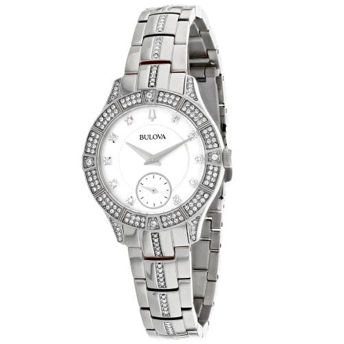 Bulova Ladies Silver Tone, Stainless Steel Bracelet Swarovski Crystal, 30m 3ATM Water Resistant Quartz Watch - Stainless steel case, bracelet and lustrous white mother-of-pearl dial embellished with 174 brilliant crystals. Features a three-hand sub sweep quartz movement, flat mineral crystal, and water resistance to 30 meters.