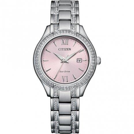 Citizen Ladies Silver Tone, Stainless Steel Bracelet Swarovski Crystal, Date Only, 50m 5ATM Water Resistant Eco-Drive Watch - When it comes to the ultimate in watches for women, the Ladies' Silhouette Crystal from CITIZEN takes the top prize. The stainless steel case and bracelet are paired with a soft pink dial, with a total of 114 crystals embedded on the case and band. Other features include the current date, as well as CITIZEN's exclusive Eco-Drive technology, so the watch is sustainably powered by light and will never require a new battery. For a feminine, beautiful watch for women, this timepiece will look great with any style and for any occasion.