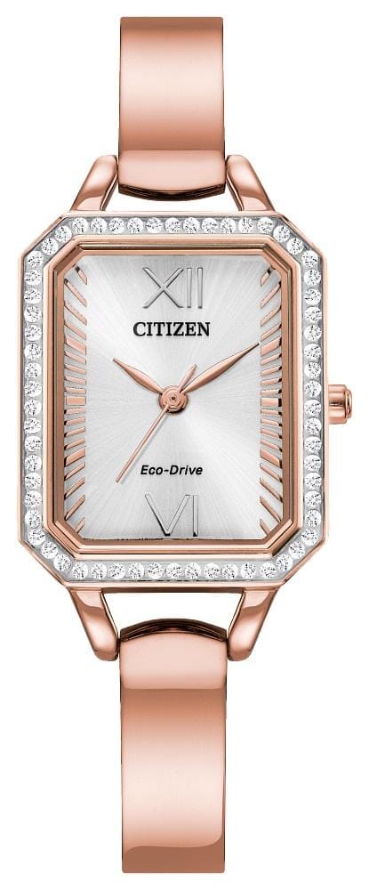 Citizen Ladies Rose Gold Tone, Stainless Steel Bracelet 50m 5ATM Water Resistant Eco-Drive Watch - Elevate your look with the Citizen Silhouette Crystal ladies’ timepiece that features both a striking and elegant appearance. The slim, pink gold-tone bracelet band is surrounded by a sparkling crystal accented bezel with a silver tone dial that exudes bold luxury. This three-hand women’s watch has a jewelry clasp with a push button and uses Citizen’s sustainable Eco-Drive technology to power itself by light. This stylish watch transitions beautifully from a day in the office to a night on the town and will add a touch of sophistication to your overall look.