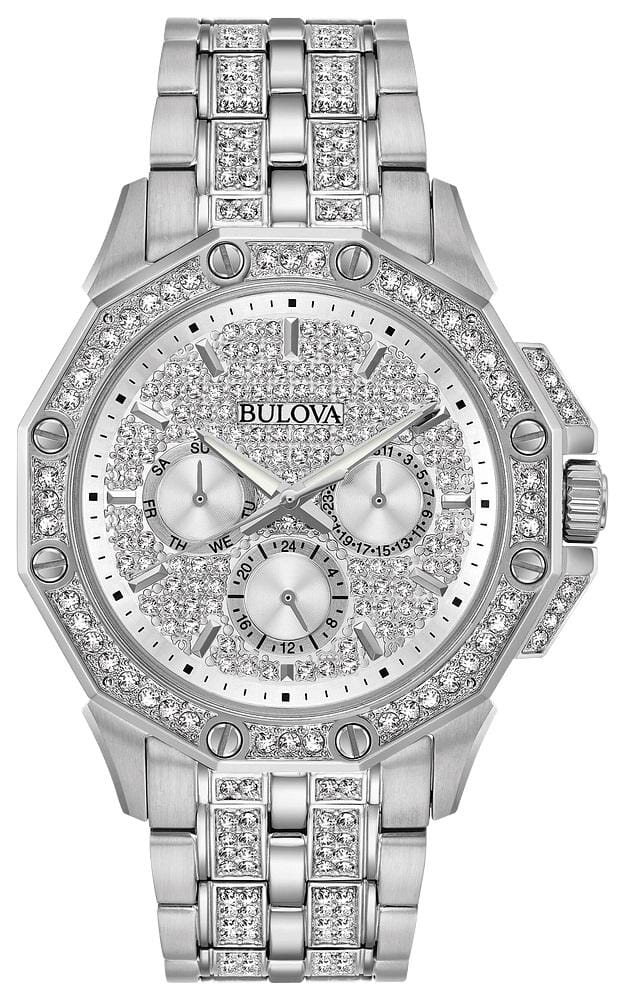 Bulova Gents Silver Tone, Stainless Steel Bracelet Day & Date, 30m 3ATM Water Resistant, 24 Hour Dial Quartz Watch - Multi-function dress watch boldly embellished with 300 crystals on the stainless steel case and bracelet, and the pave set six-hand silver white dial. Flat mineral crystal, deployant closure, quartz movement, and water resistance to 30 metres.