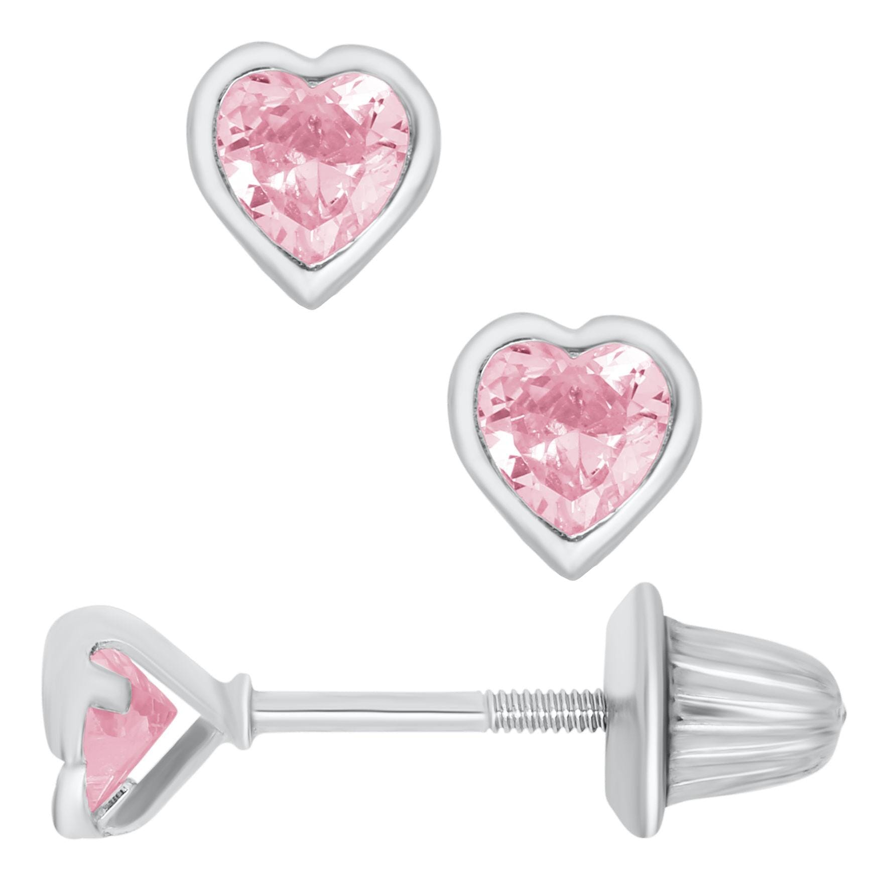 These adorable heart-shaped stud earrings are crafted from Sterling Silver and set with pink cubic zirconia stones, adding a sweet touch of colour to any little one's collection. Each earring measures 5.00mm in height and 5.00mm in width, making them perfectly sized for babies and young children. The secure screw-back design ensures comfortable and safe wear. These charming earrings are ideal for everyday wear or special occasions.