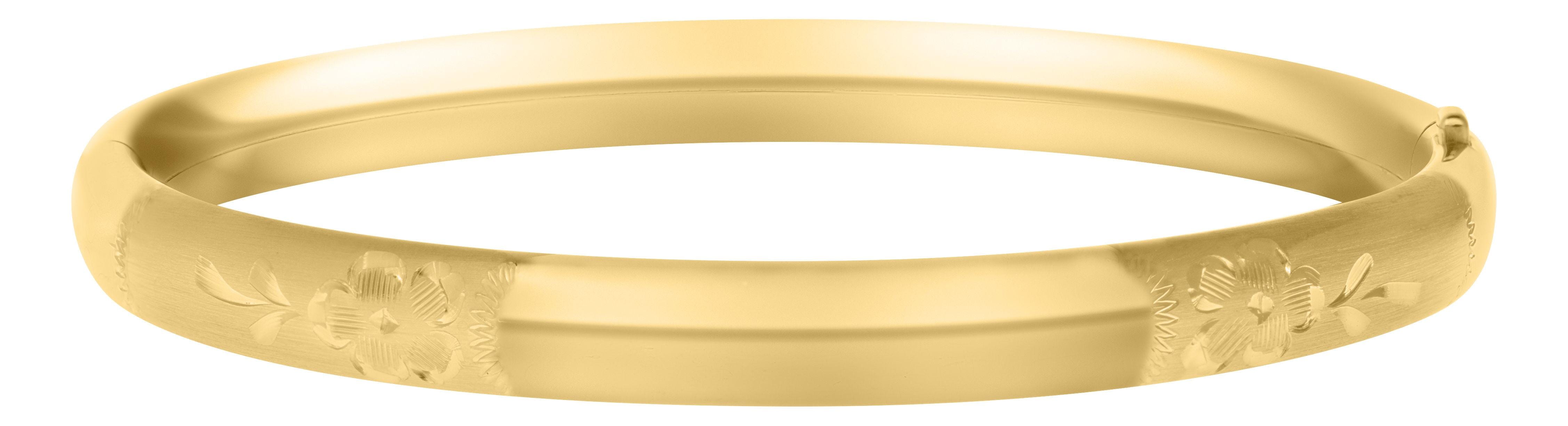 This 14K Yellow Gold-Filled bangle bracelet is an adorable piece perfect for a baby or young child. The bracelet features a delicate floral engraving that adds a touch of charm to its design. Measuring 5.25 inches, this gold-filled bangle is a thoughtful gift for a special occasion, combining elegance with a timeless appeal. The smooth, polished finish enhances its classic look, making it a lovely addition to any little one’s jewellery collection.