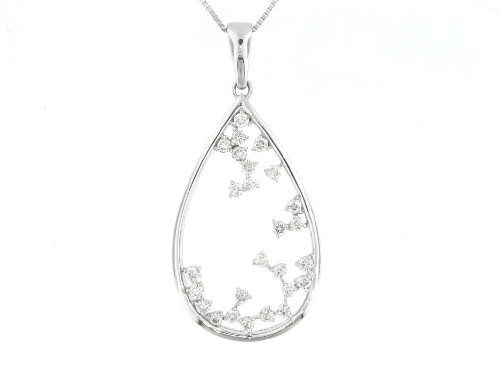 This exquisite 14 karat white gold pendant necklace features a delicate teardrop design adorned with round brilliant cut diamonds. The scattered diamond arrangement within the teardrop creates a captivating and elegant look. This piece is perfect for adding a touch of sparkle to any outfit. The pendant comes with a 14K white gold chain, which beautifully complements the pendant's refined design. The pendant measures 32.0mm in height and 14.9mm in width. The intricate and graceful design of this pendant makes it a cherished addition to any jewellery collection.