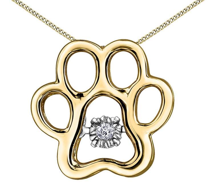 10 Karat Yellow Gold Diamond Paw Print Pulse Pendant Necklace. 0.02 Carat Total Diamond Weight. This pendant comes with an 18 inch 10K yellow gold chain as shown. Alternate chain length, weight, or style options are available.