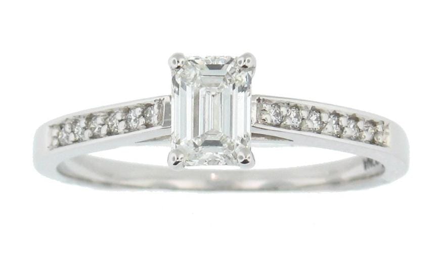 This elegant 14 Karat White Gold engagement ring showcases an emerald-shaped diamond, complemented by sparkling diamond shoulders. The classic solitaire design emphasizes the clarity and depth of the central diamond, making it a timeless choice. With its sleek lines and refined setting, this ring is perfect for celebrating enduring love. A sophisticated and graceful piece, ideal for making a lasting impression.