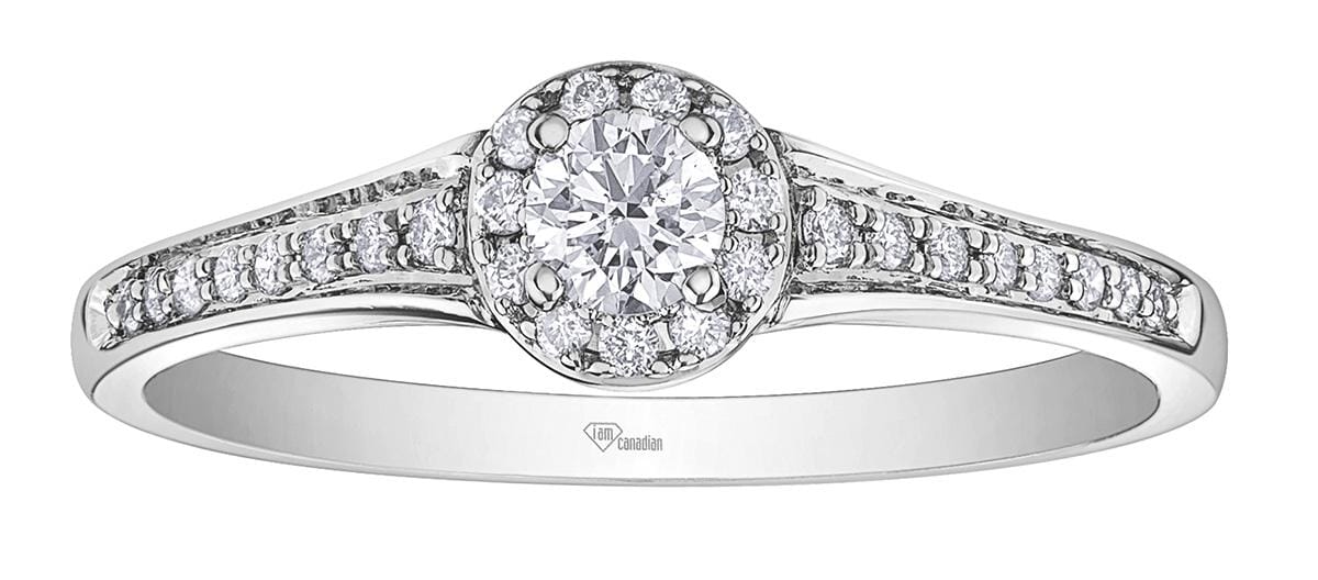 10 Karat White Gold Canadian Diamond Engagement Ring. 0.14 Carat Center Diamond 0.25 Carat Total Diamond Weight.